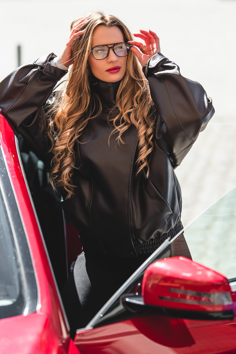 Czekoladowa skórzana kurtka damska ze stójką o luźnym oversizowym kroju zapewnia wygodę i komfort na co dzień.