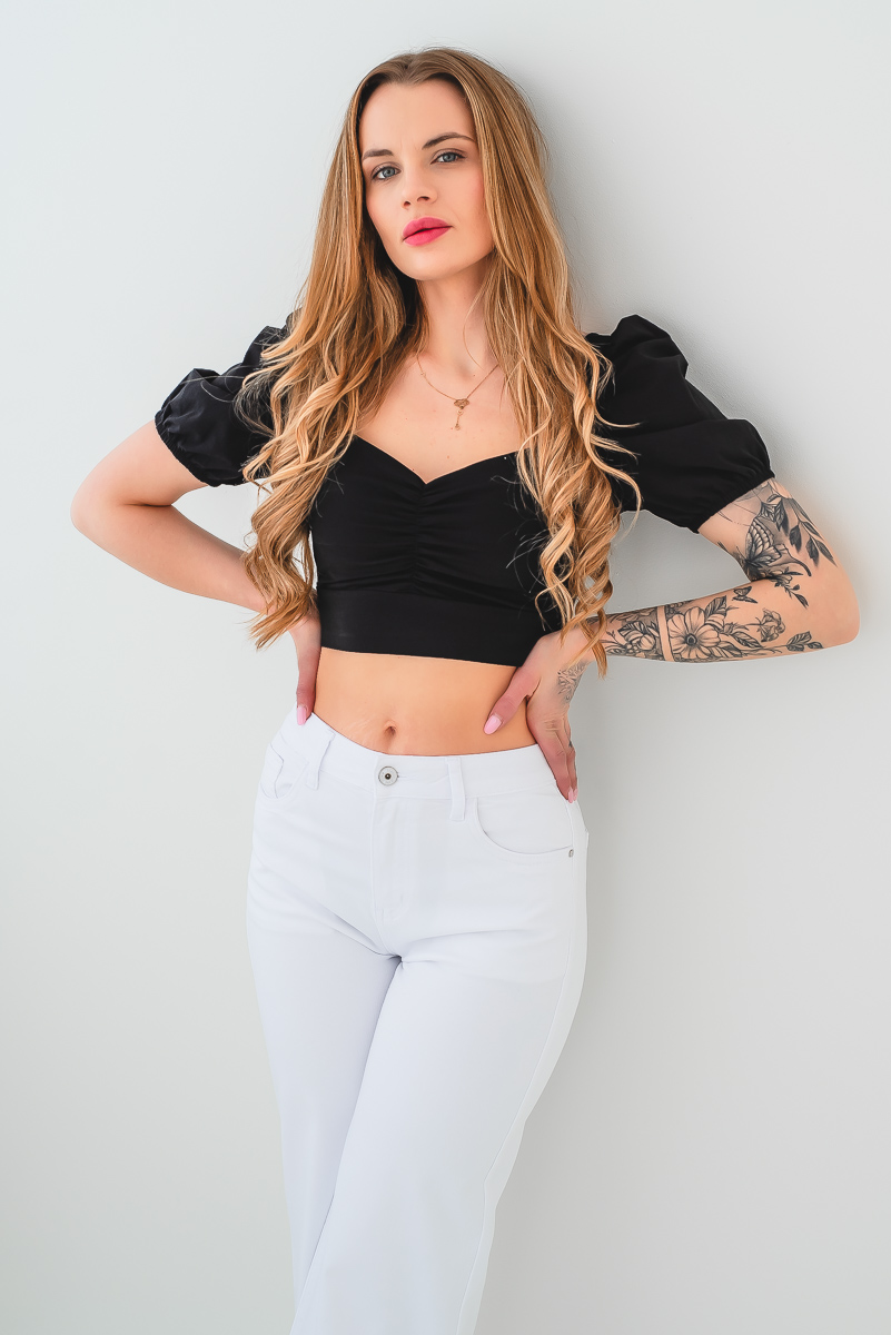 Model X261 to wygodne damskie spodnie szerokimi nogawkami, które łączą komfort klasycznych jeansów z bardziej kobiecym, dopracowanym wyglądem. Miękki, elastyczny materiał, wysoki stan i rozszerzane nogawki sprawiają, że świetnie układają się na sylwetce i zapewniają wygodę przez cały dzień.