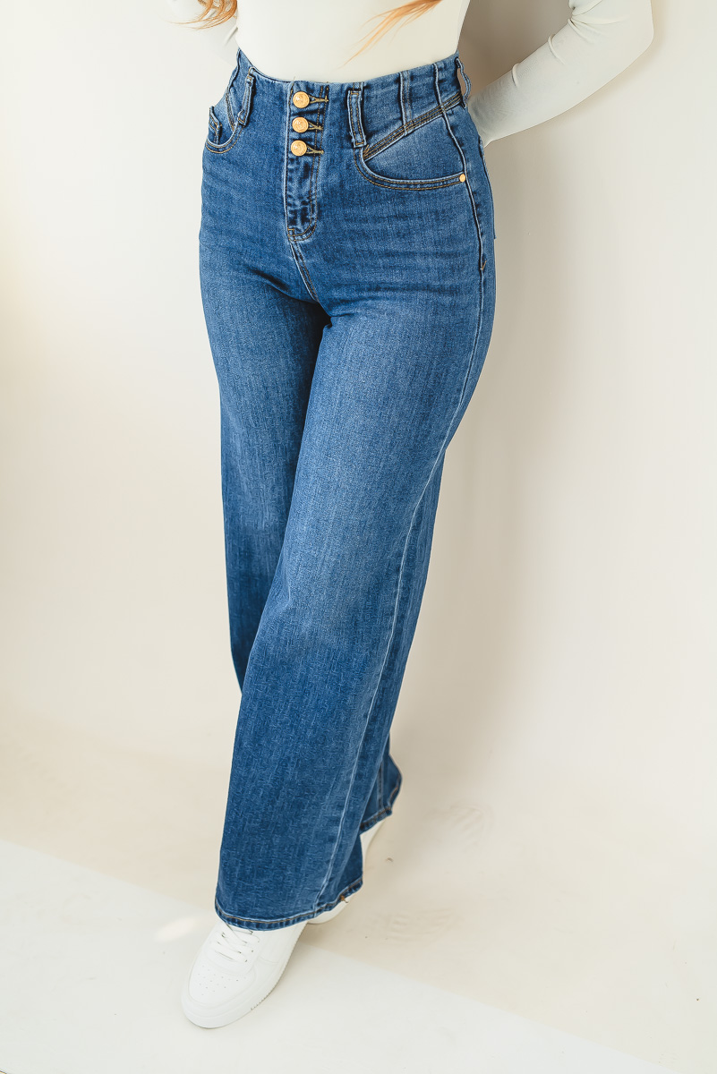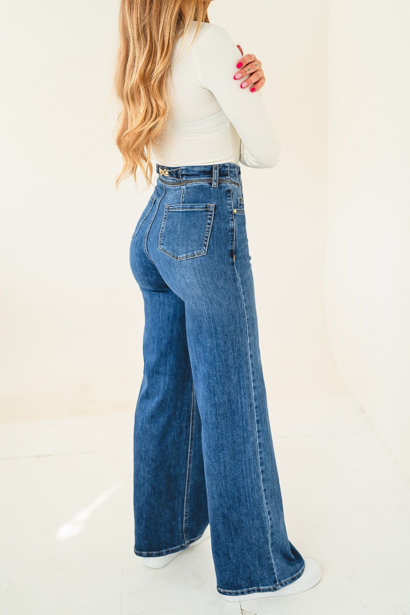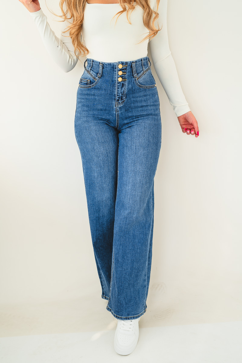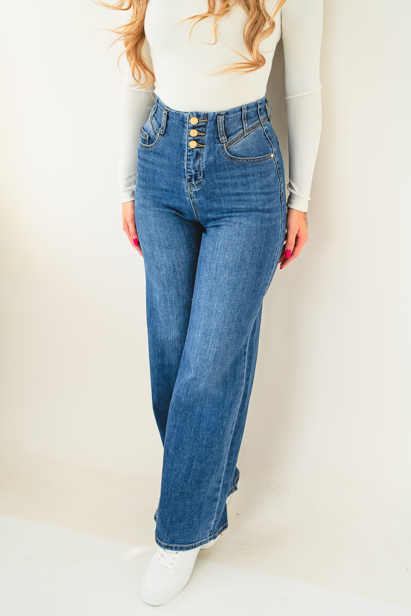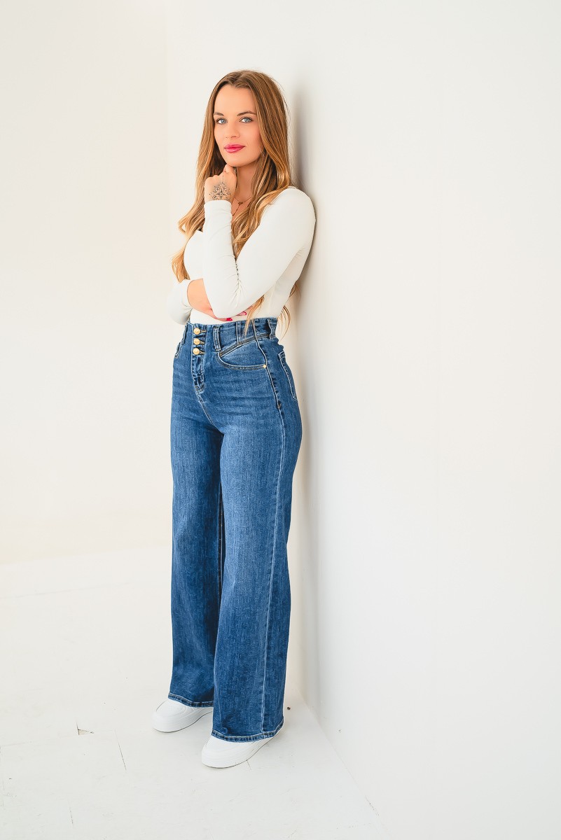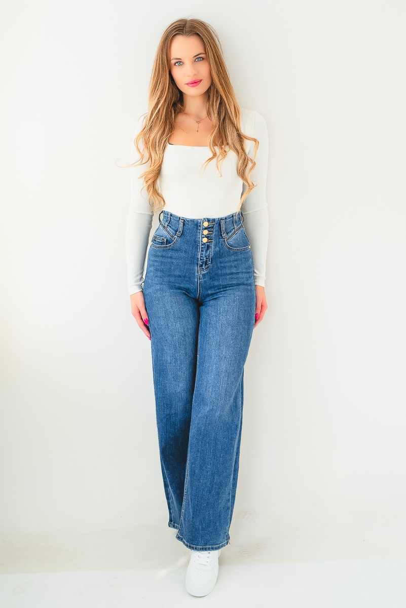 X373 Jeansy damskie wide leg – spodnie z wysokim stanem, złotymi guzikami, modelujące talię, wyszczuplające brzuch i wydłużające nogi, rozmiary XS–XL