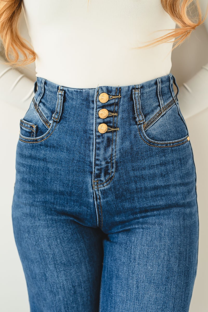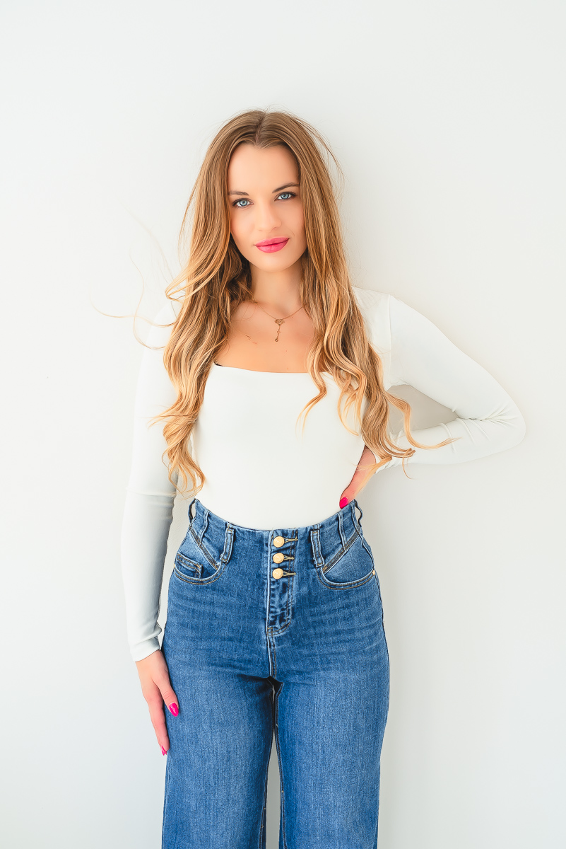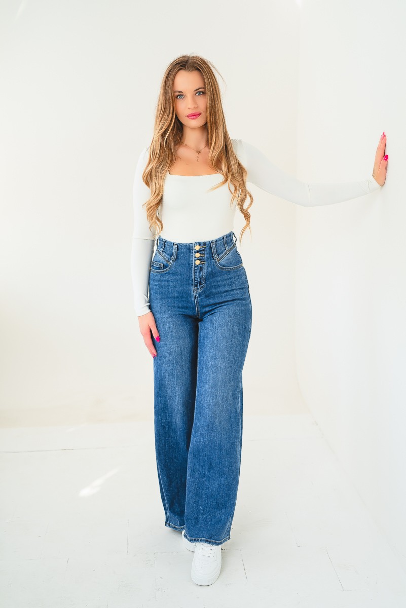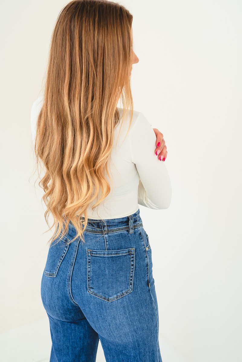 - Kolor: niebieski denim – klasyczny i łatwy w stylizacji z ulubioną bluzką, body czy topem
