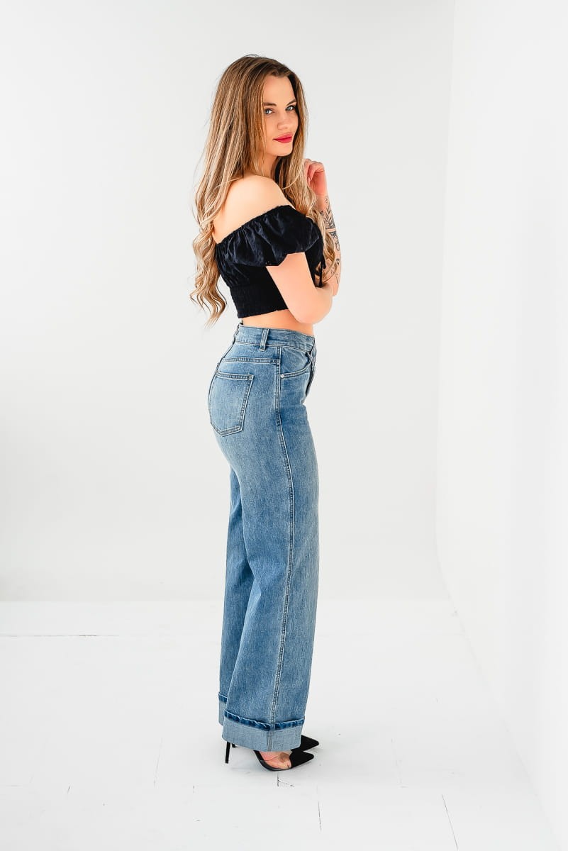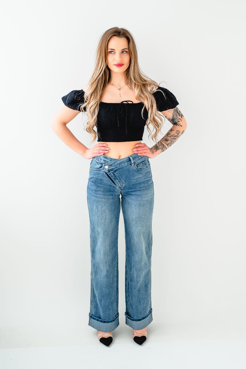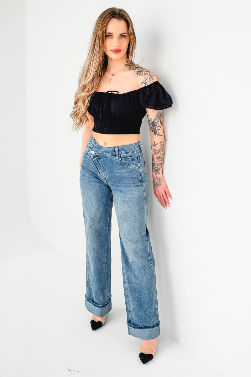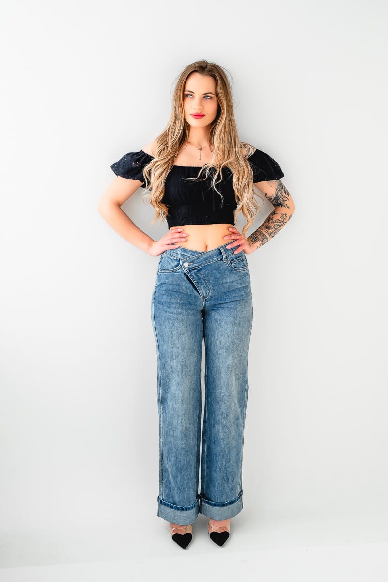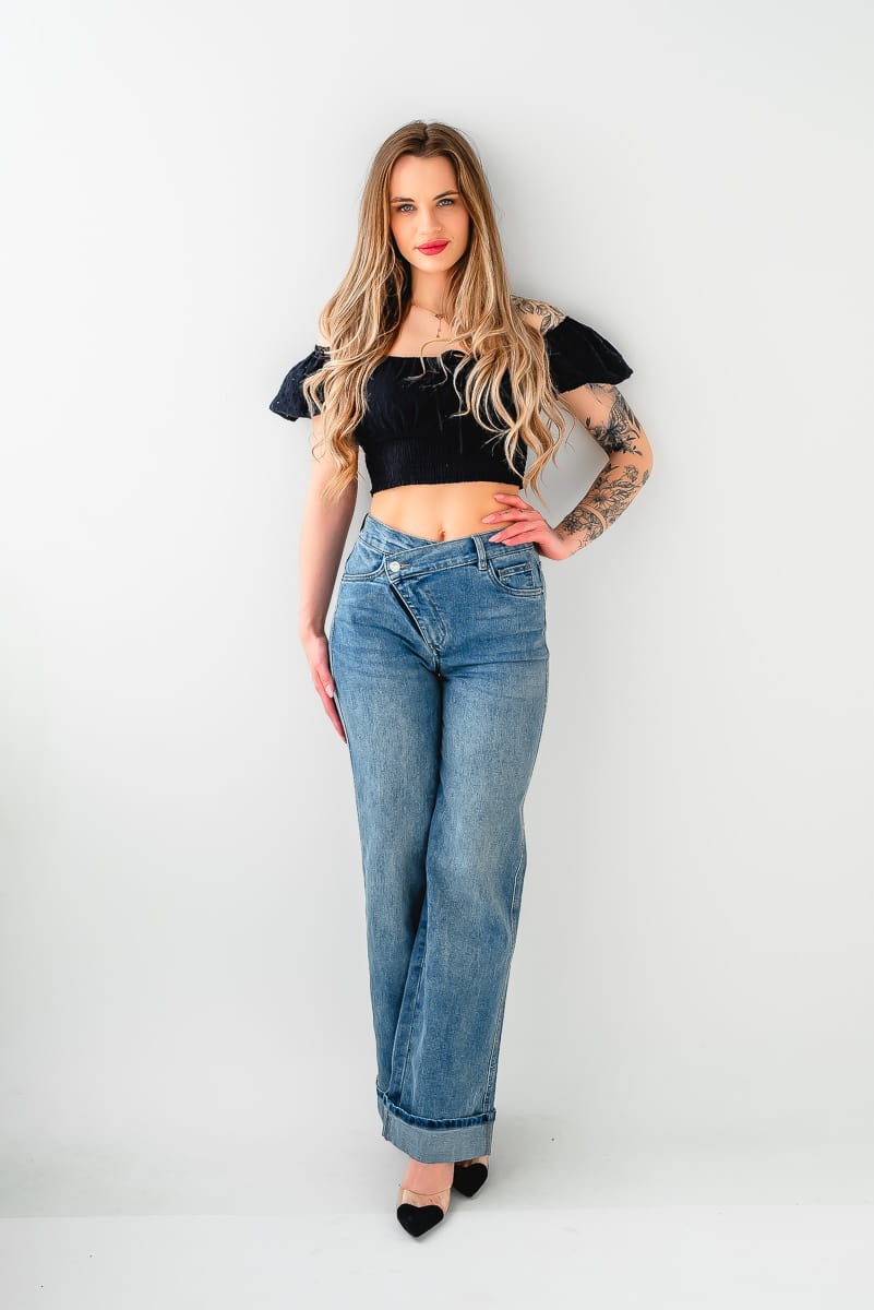 Stylowe spodnie damskie WIDE LEG jeans. Wykończone wysokim asymetrycznym stanem.