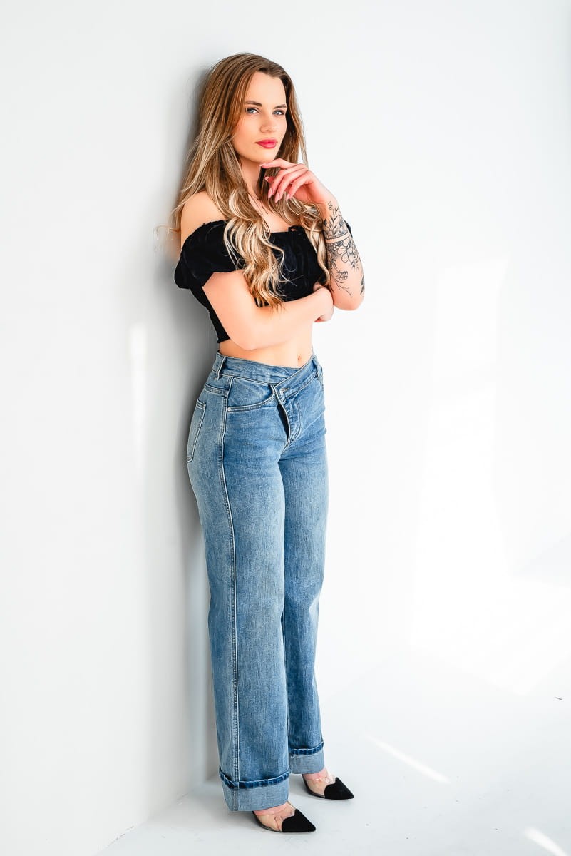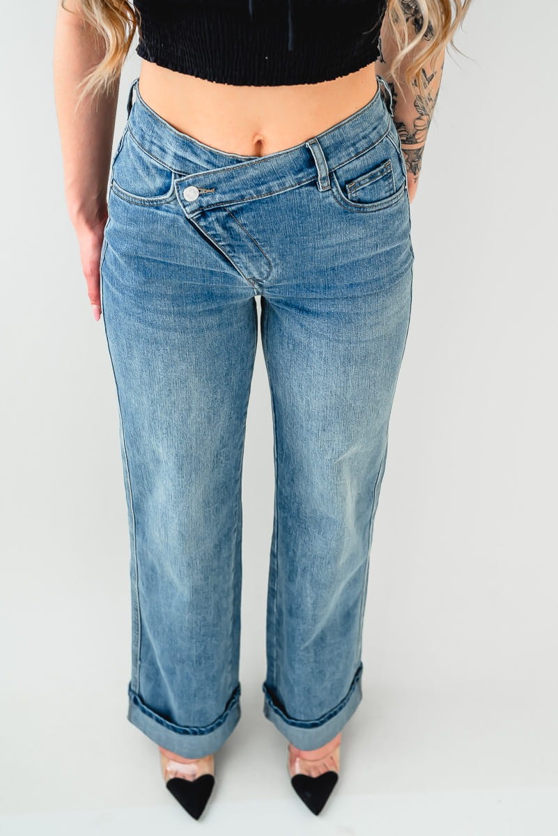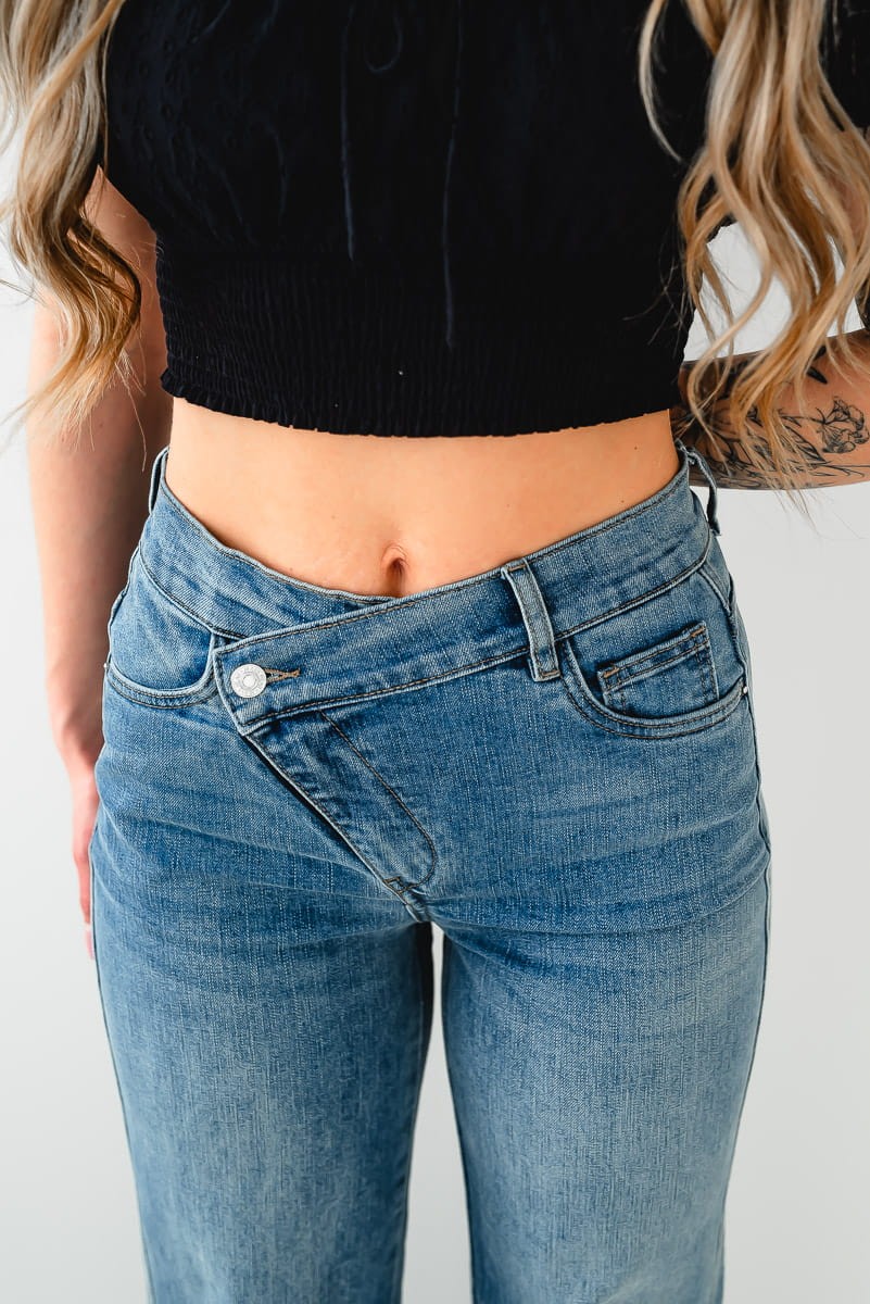 - Wysoki stan i asymetryczny pas sprawiają, że jeansy wyglądają modnie i nietuzinkowo.