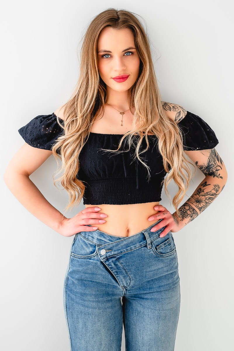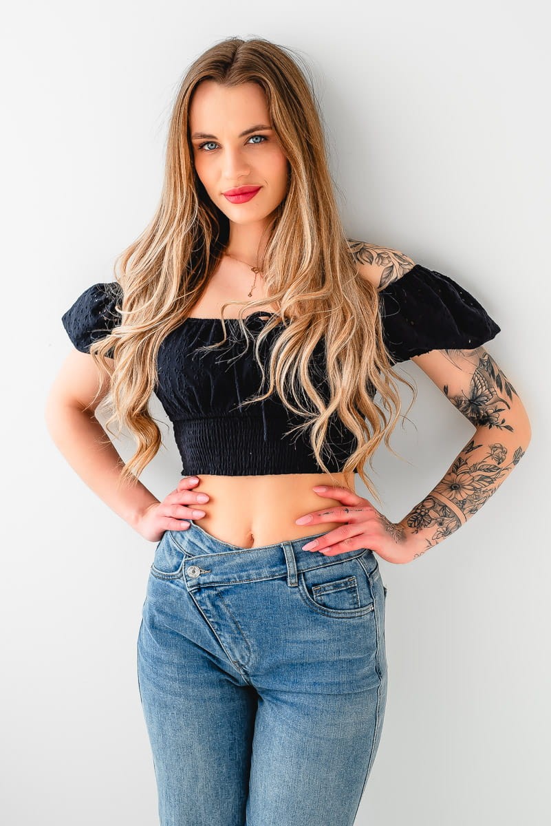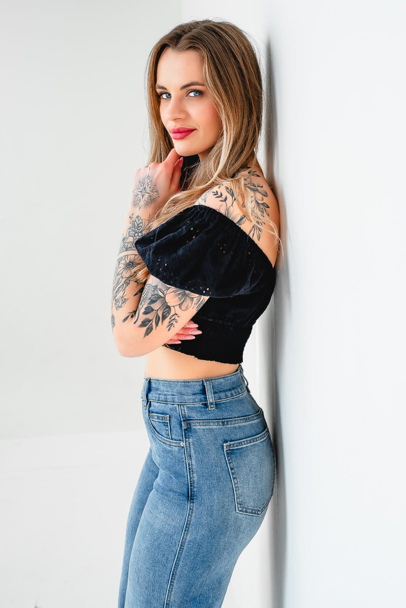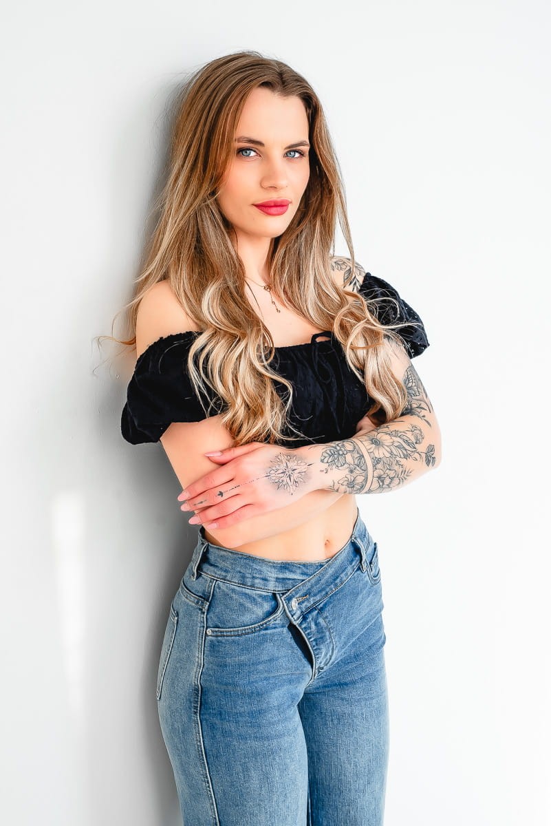 - Wysoki stan i asymetryczny pas sprawiają, że jeansy wyglądają modnie i nietuzinkowo.