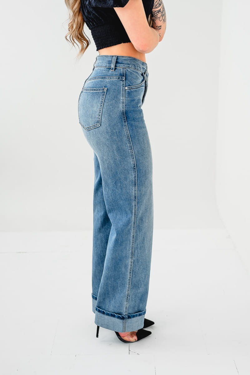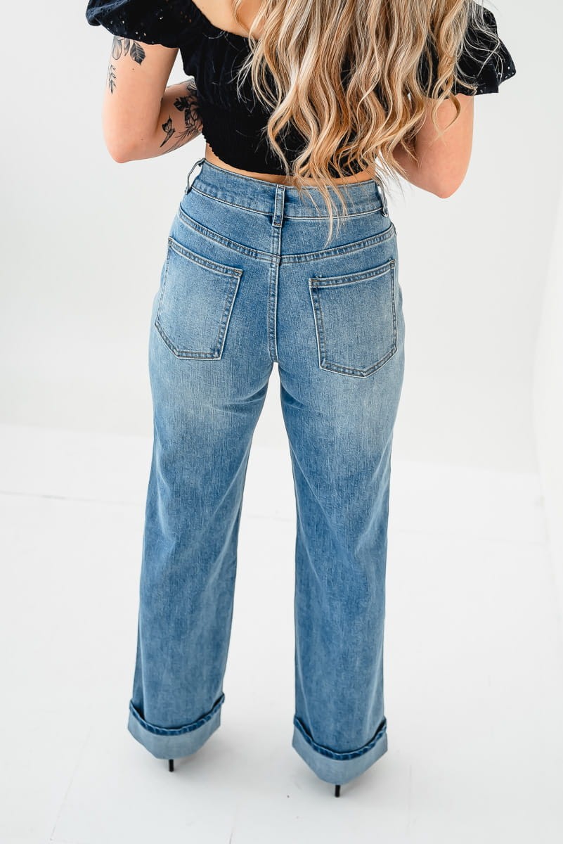 Asymetryczne zapięcie i wywinięte nogawki dodają charakteru, podkreślając ich nowoczesny design.
