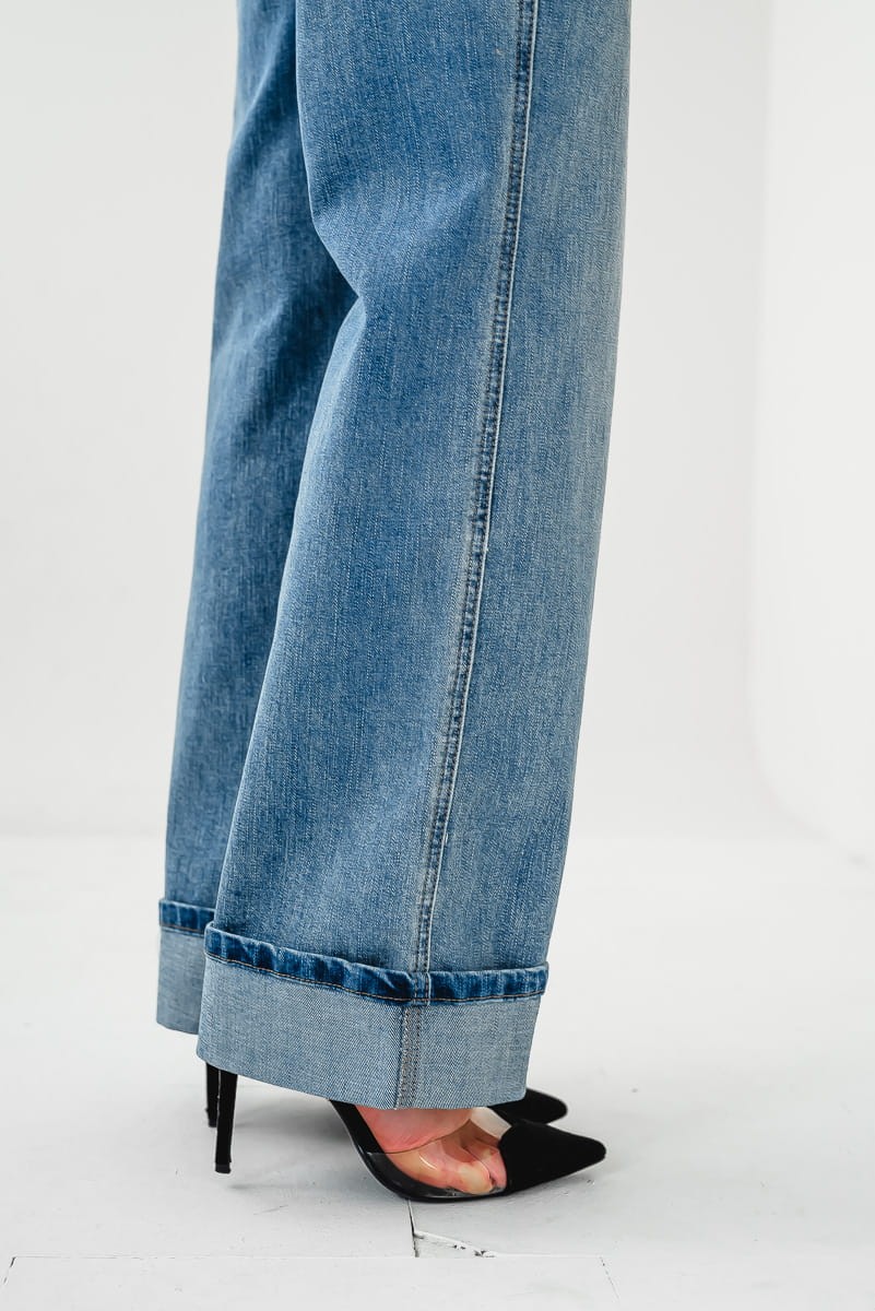 - Nogawki: Szerokie nogawki wykończone szerokim podwinięciem. Podwinięcie można regulować lub całkowicie odwinąć.
