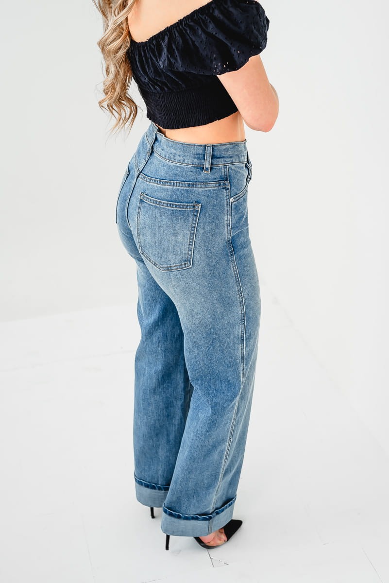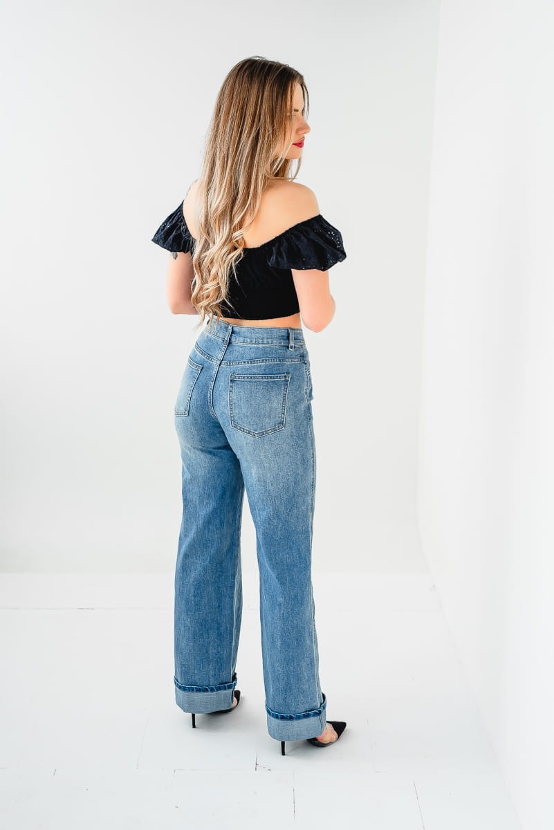Modny krój jeansów z szeroką nogawką zapewnia wysoki komfort noszenia na co dzień.