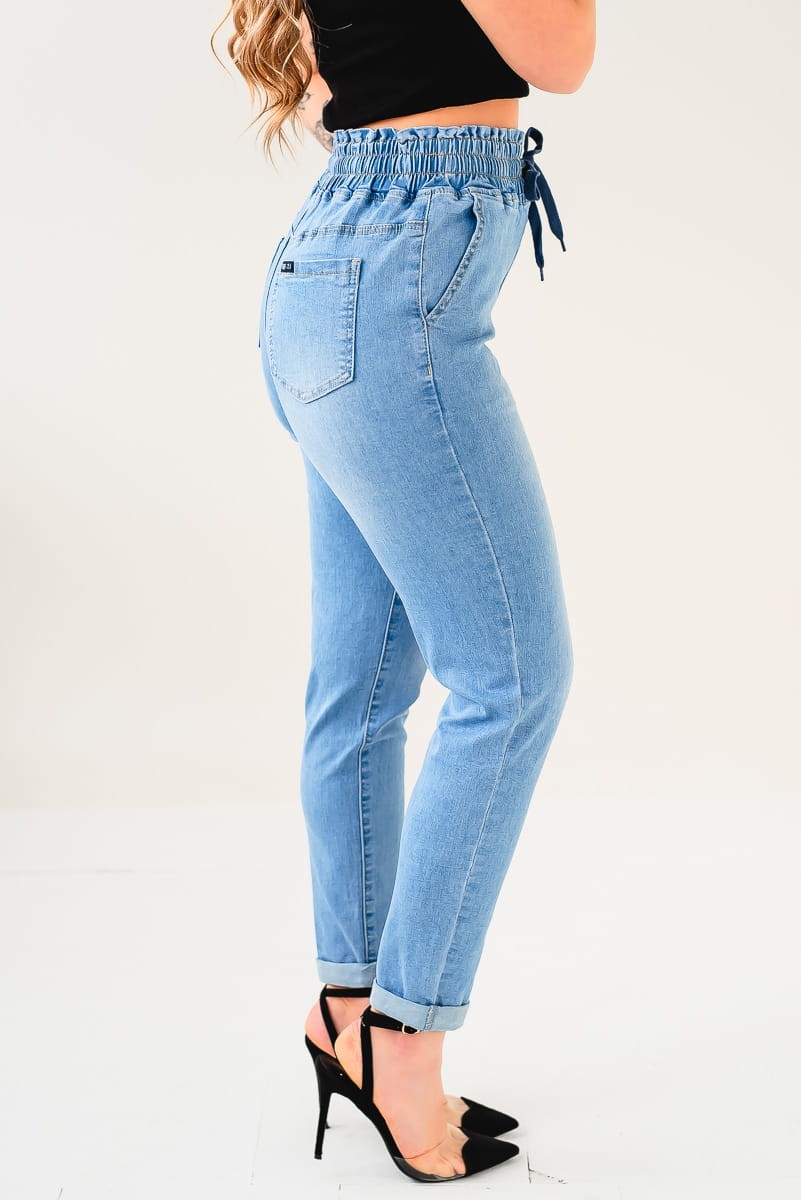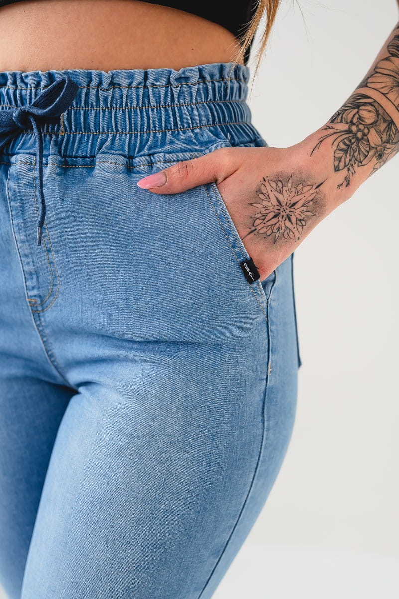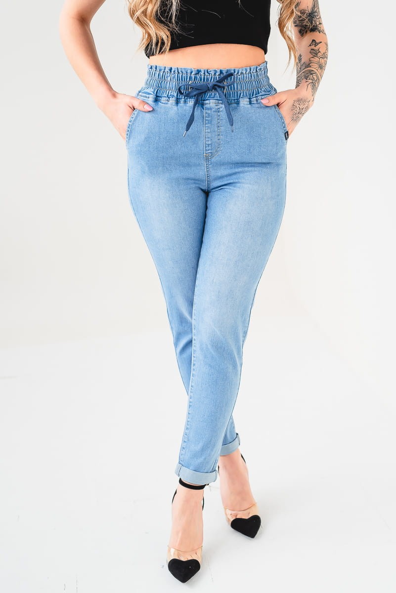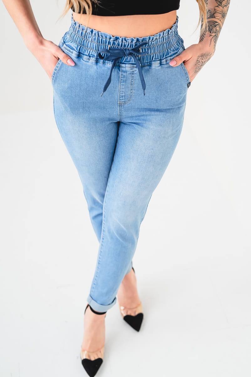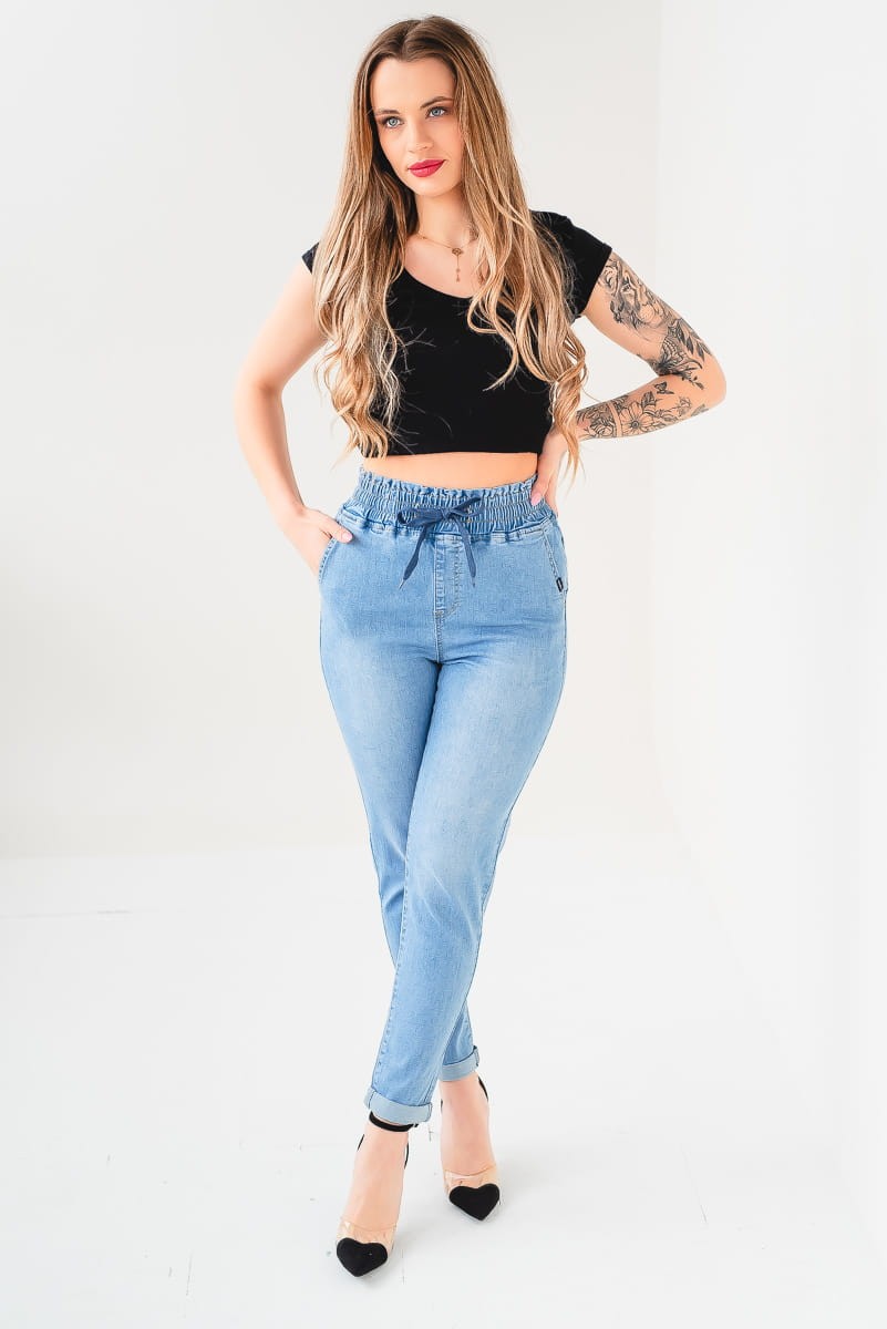 X408 Jeansowe damskie joggery SEPATI jasne spodnie z elastyczną gumą w pasie xs s m l xl