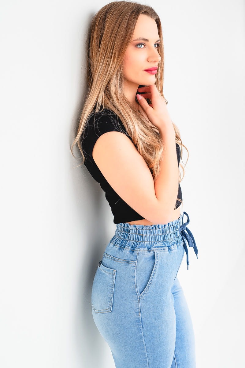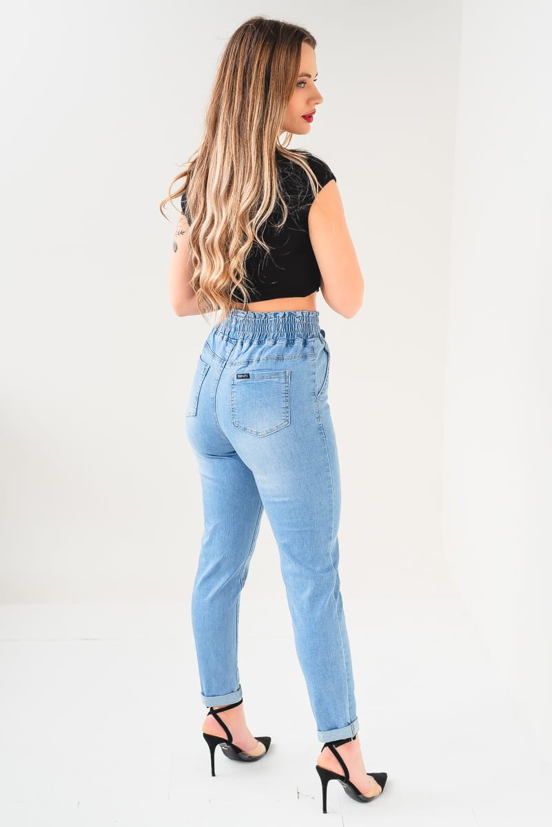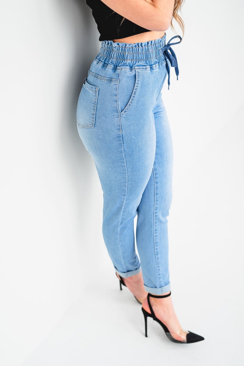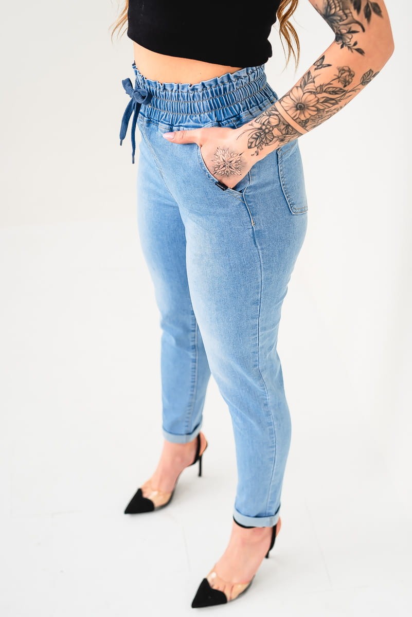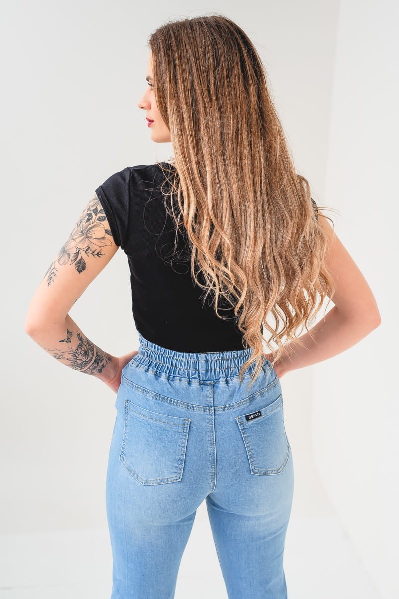 Jeansowe klasyczne jasnoniebieskie spodnie damskie marki SEPATI. Są to wygodne miękkie i elastyczne spodnie typu joggery czyli jeansy dla kobiet zapewniające swobodę ruchów, nie opinając nóg i nadając każdej stylizacji lekkości. Wykonane są z najwyższej jakości elastycznego miękkiego denimu, który jest trwały i wygodny, zapewniając swobodę noszenia przez cały dzień. Dzięki temu że są to jeansy z elastyczną gumą w pasie, pięknie podkreślają talię oraz wysmuklają sylwetkę, a lekko zwężane nogawki sprawiają, że sylwetka wygląda bardziej proporcjonalnie i harmonijnie.
