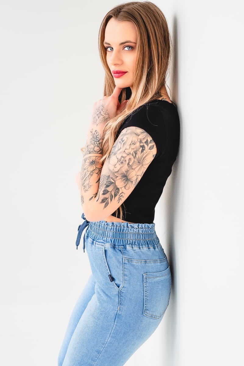 - Materiał: Elastyczny denim (65% bawełna, 33% poliester, 2% elastan) – zapewnia komfort i trwałość.