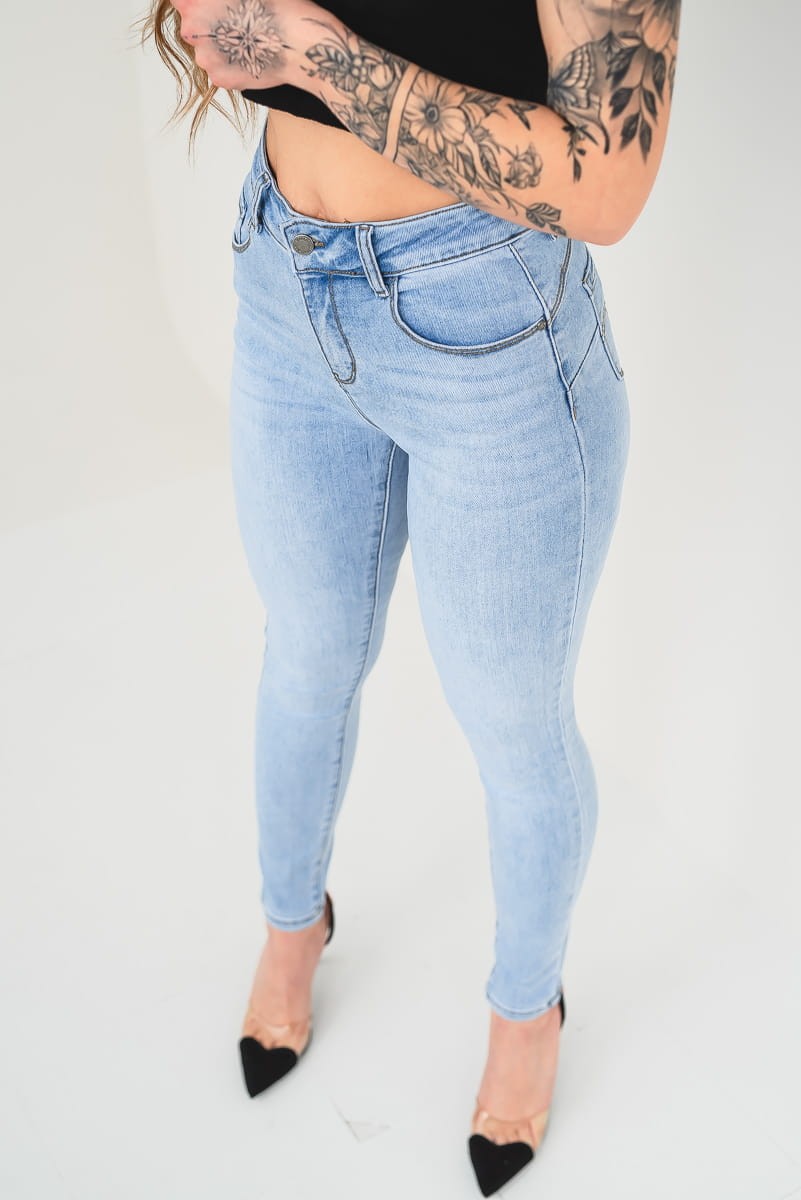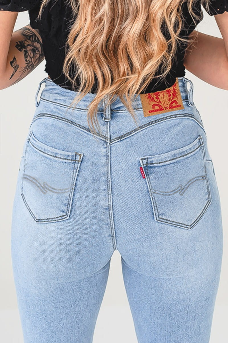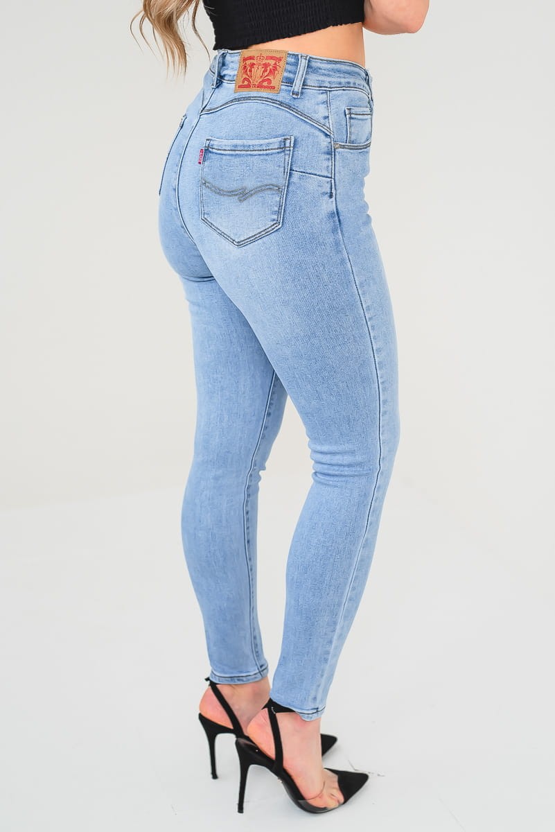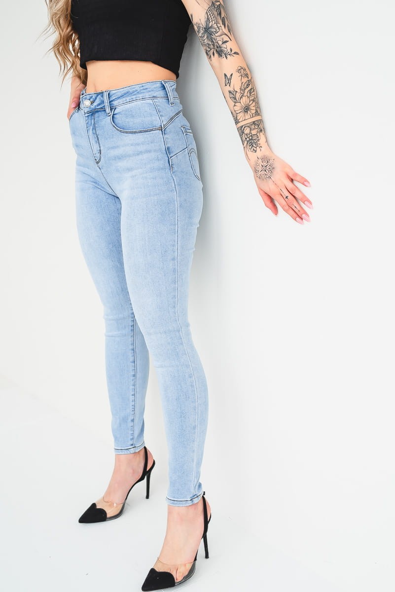 Jasne jeansowe spodnie damskie typu skinny z przeszyciem push up.
