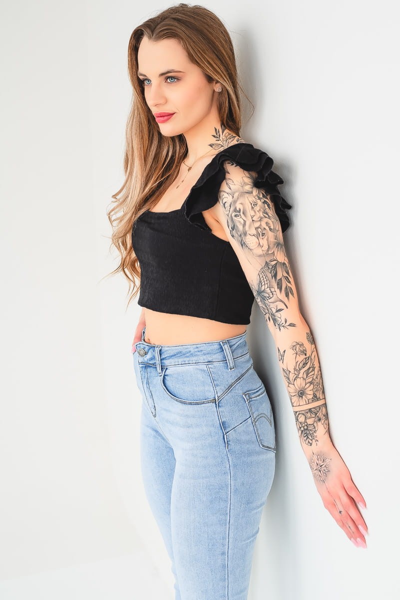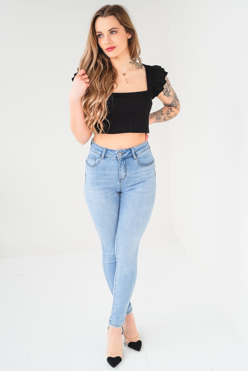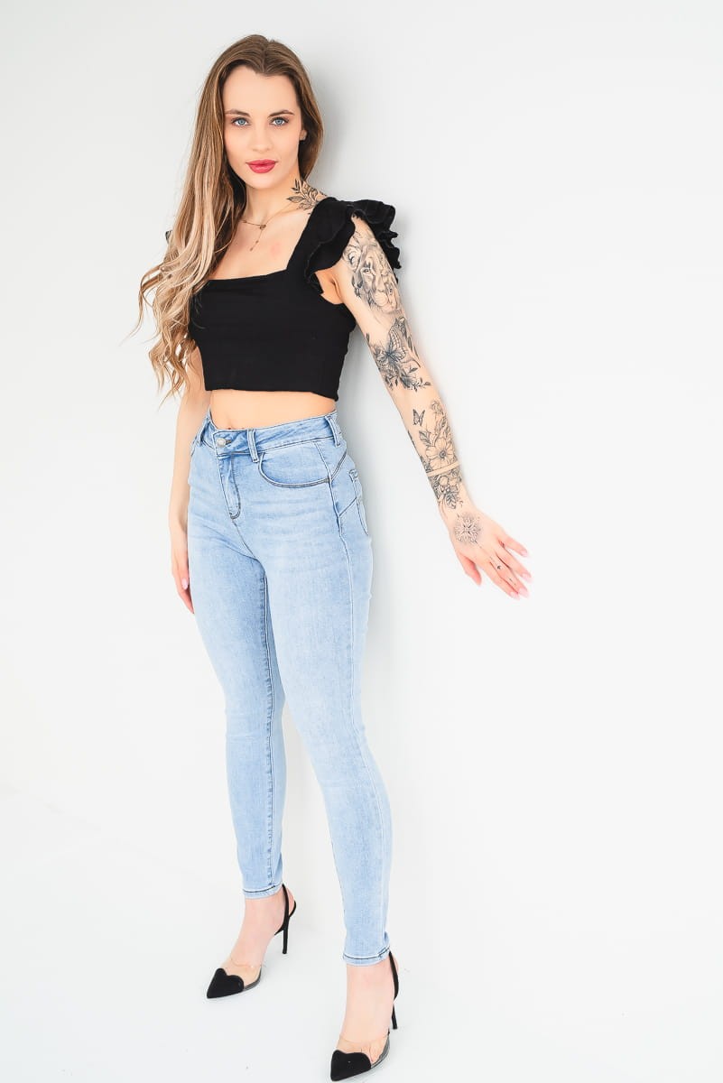 - Krój: Skinny – idealnie przylegający krój, podkreślający nogi, biodra oraz pośladki.