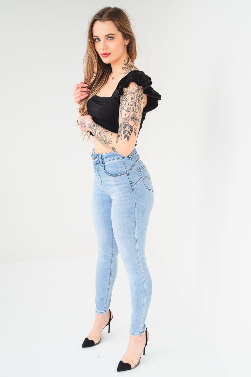 Kobiece skinny push up w kolorze jasnego jeansu wysmuklają talię
